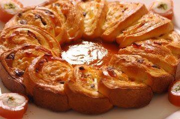 - تدهن صينية فرن مستديرة بقليل من الزبدة وترص حلقات العجين بحيث يوضع طرف كل حلقة على الحلقة التي قبلها لتكون على شكل سلسلة