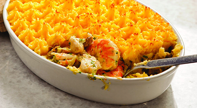 في وعاء آخر تخلط البطاطس مع صفار البيض والكريمة وجبن البارميزان، ثم يغرف خليط البطاطس أو يضخ على خليط السمك وتخبز الفطيرة في الفرن على درجة حرارة 200 لمدة 20 دقيقة إلى أن تكتسب اللون الذهبي.