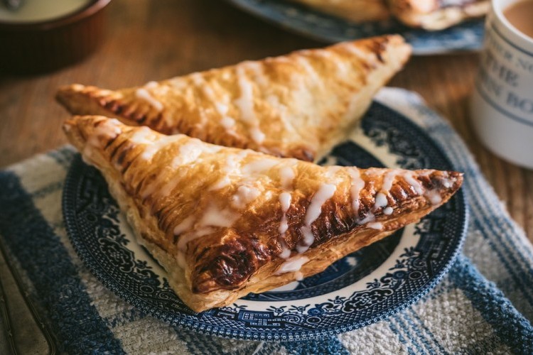 - يخرج خليط التفاح من الفريزر ويضاف سكر الديميرارا. توضع ملعقة كبيرة واحدة من التفاح في منتصف كل مربع. تدهن حافة نصف كل مربع بالبيض المخفوق، ثم تثنى على الجانب الآخر، تغلق الحواف باستخدام شوكة مع ثقب الجزء العلوي للسماح للبخار بالخروج.