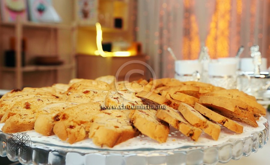 - تضاف مقادير التزيين. ويدلك العجين لتثبيتها. تشكل عصي انطلاقا من العجين وتدخل إلى الفرن المسخن على درجة الحرارة 180.