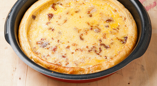 يُحمر اللحم المقدد في مقلاة، ثم يُرص في قاعدة صينية خبز. يُصب العجين على اللحم مع التأكد من تقسيمه بالتساوي في الصينية.