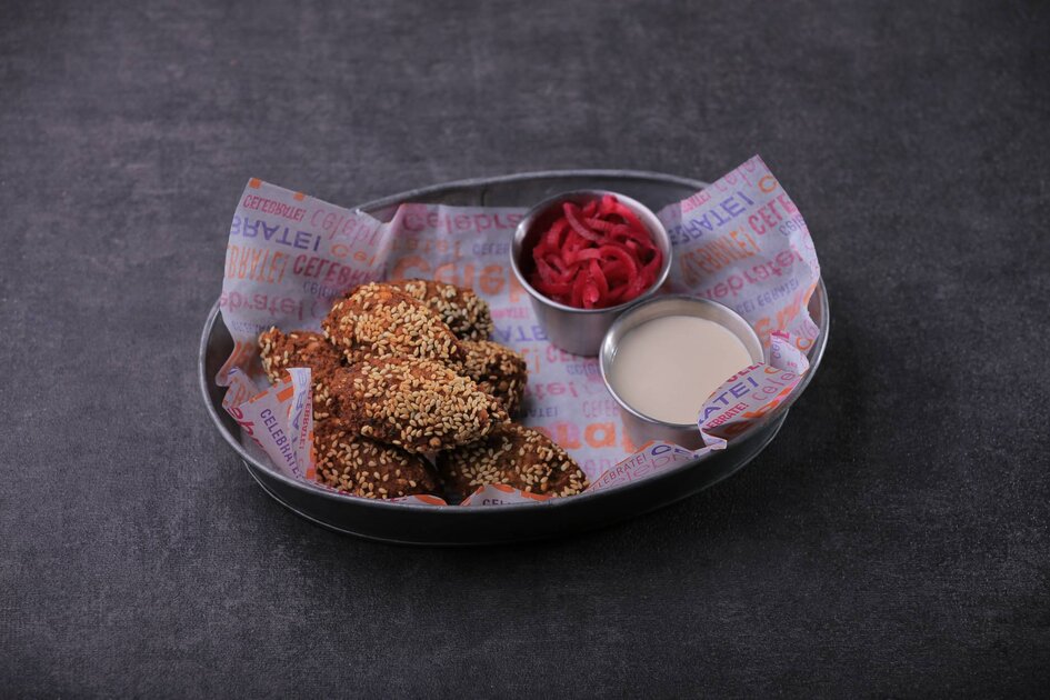 يزين كل قرص فلافل بالسمسم (إختياري) وتقلى غمراً في الزيت على حرارة 185 درجة مئوية حتى تصبح ذهبية ومقرمشة، تقدم مع صلصة الطحينة والمخلل.