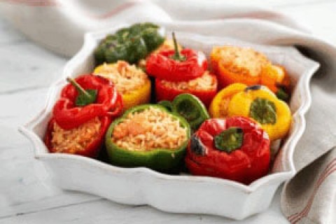 - يُقسّم مزيج الأرزّ المبلّل بالتساوي ويُحشى كلّ قرن فليفلة (بنسبة ¾). يجب ألاّ يتمّ الضغط على الفليفلة كثيراً و/أو الإفراط بملئها لأنّ الأرزّ سيمتدّ خلال الخبز.