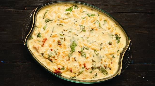 يُضاف الدجاج والباستا إلى القدر؛ يُتبل الخليط بالملح والفلفل. توضع الباستا والدجاج في طبق خبز ويُرش ببقية جبن البارميزان.