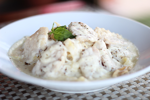 3. تصفى فيتوتشيني و توضع بصينية و يوضع فوقها الدجاج و يضاف عليها كريمة الطبيخ.