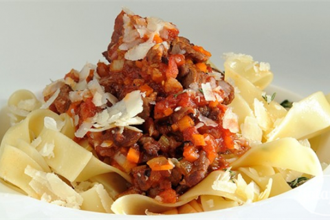 - بعد ما نصفى المكرونة ونشطفها هنقلبها مع الصوص فى حلة كبيرة وتُغرف فى طبق التقديم وهنزين الوجه بالجبنة البارميزان المبشورة.. بالهنا والشفا.
