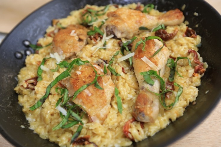 2. في مقلاة أخرى، ضعي الزبدة وعند الذوبان، ضعي الثوم المهروس، والبصل المفروم، وقلبي حتى يذبل. ثم ضعي البندورة المجففة المفرومة، ثم رشي الملح، والفلفل الأحمر، صبي مرق الدجاج وكوب كريمة الطبخ، حركة المكونات، ثم أضيفي جبنة البارميزان المبشورة، أضيفي معكرونة الأورزو وحركي.