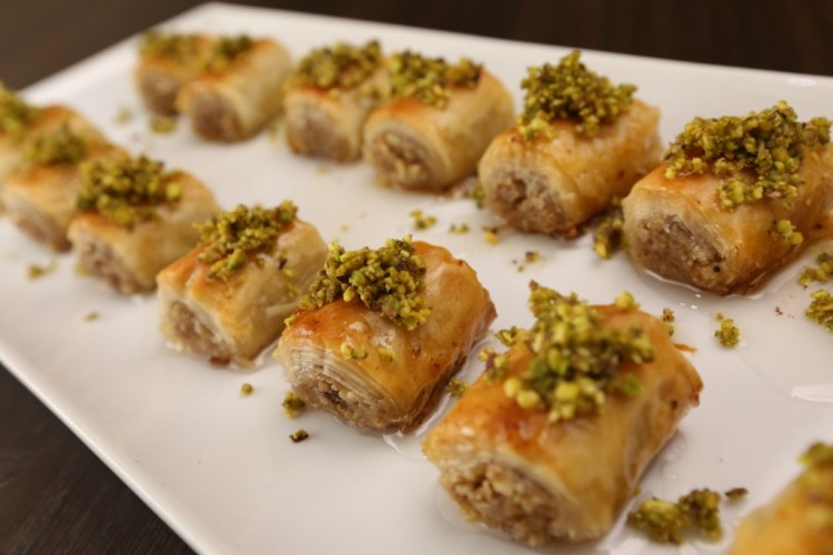 6. يصب القطر (الشيرة) البارد على الكلاج ويزين بالفستق الحلبي.