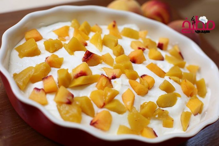 3. وزعي جزء من الكريمة فوق البسكويت ثم جزء من المانجا والدراق المفروم.
