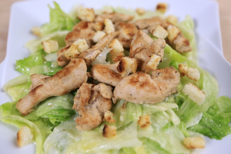 6. للتقديم، نسكب خس الآيسبرغ بالصلصة في طبق التقديم ونزينه بشرائح الدجاج المقطع والمشوي، وقطع من التوست المحمص.