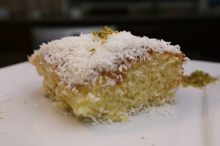 5-  تزين الكيكة بكوب من جوز الهند المبشور وتقدم باردة.