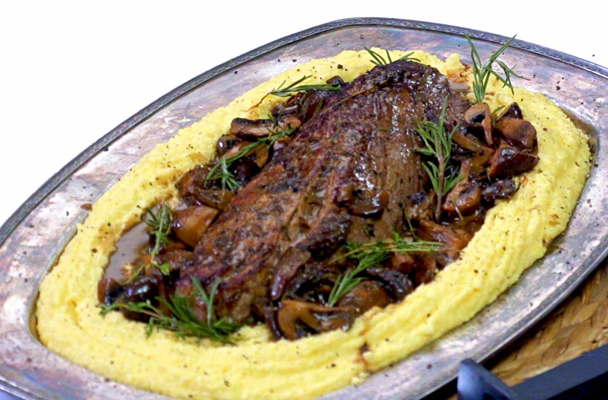 للتقديم، نغرف البولينتا في طبق التقديم و نضع في الوسط الفيليه المشوي و يوزع جزء من المشروم حول الفيليه و المتبقي يقدم في طبق جانبي