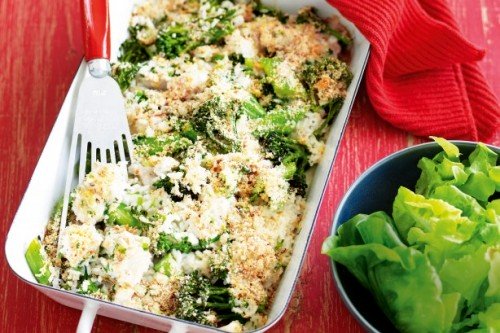 - حضري الفرن على درجة حرارة 200°C، ضعي كريمة جوز الهند في مقلاة كبيرة، على نار هادئة-متوسطة، أضيفي البروكلي، الأرز، الكراث، الكزبرة، وصوص السمك.