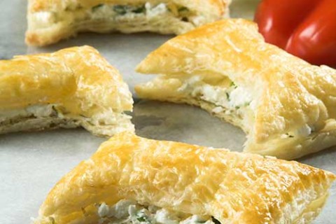 6. باستعمال السكين اقطعي كل فطيرة الى طبقتين، ضعي بعض الجبن على الطبقة السفلى ثم ضعي الطبقة الثانية فوق الحشو.