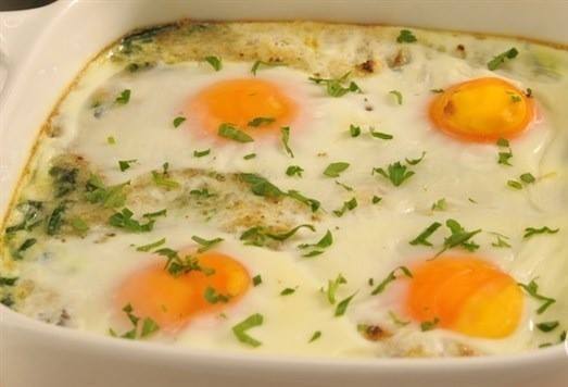 - يصنع 4 حفر صغيرة في السبانخ، يضاف إلى كل حفرة بيضة تخبز في الفرن وتقدم .