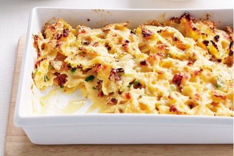 - فى صينية مدهونة بالزبد نضع المكرونة ثم خليط الخضر ثم يصب فوقهم خليط البيض وينثر فوقهم الجبن.