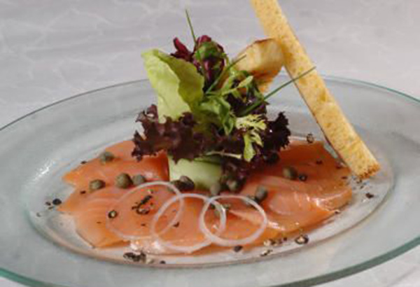 1. يقطع السلمون المدخن إلى شرائح رقيقة، توزّع على طبق التقديم بعناية حتى لا تتمزق.