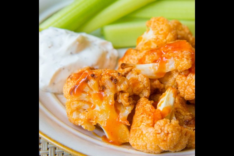 7. اخرجي الزهرة من الفرن وضعيها في طبق التقديم وصبي صلصة البوفالو المحضرة فوقها وقدمي القرنبيط ساخنا إلى جانب الكرفس وصوص الجبن حسب الرغبة.
