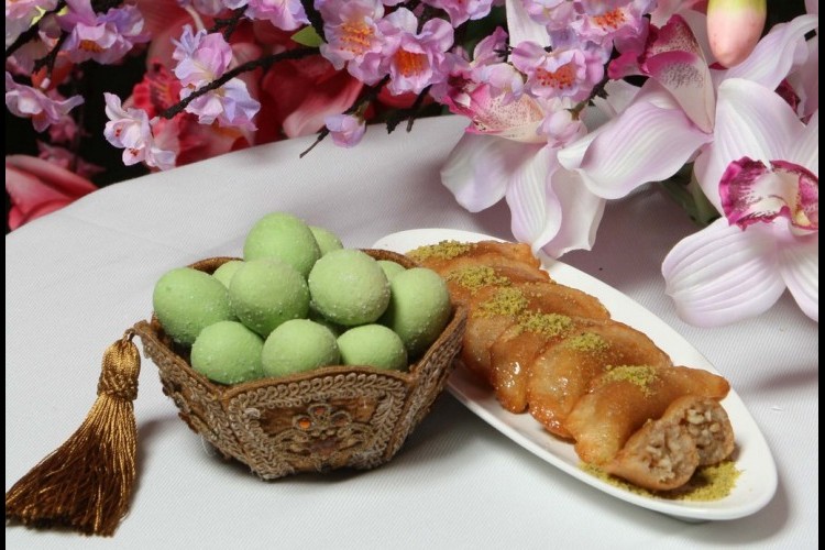 4 تغمر في القطر ثم ترص في طبق التقديم، وتزين بالفستق الناعم