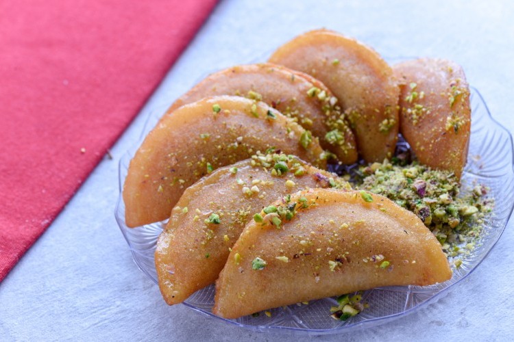 - أدخلي الصينية للفرن على حرارة 180 درجة لمدة 25 دقيقة حتى تصبح القطايف ذهبية اللون ومقرمشة.