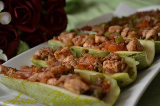 - تحشى الكوسة المقطعة نصفين بالطول بخلطة الدجاج .