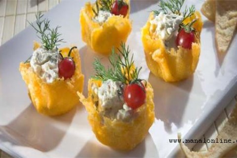 - الحشو: في طبق صغير ضعي الجبن، الفلفل، الطماطم، الشبت والزيت، قلبي بالشوكة الى ان تتفتت الجبن وتختلط. وزعيها على كؤوس الجبن.
