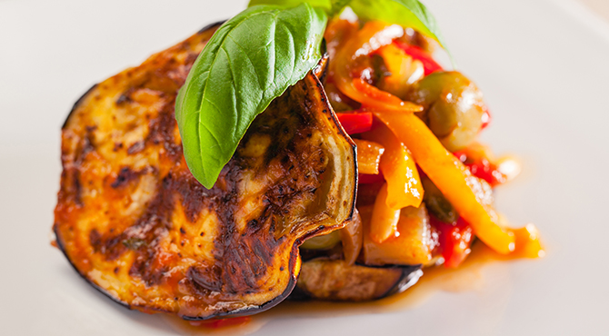 تطهى على نار هادئة حتى تتحمر قطع الباذنجان جيداً في الفرن ثم تقلب في المقلاة.