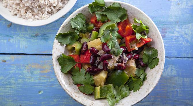 يرش مسحوق الكاري ثم يضاف الأناناس مع العصير وحليب جوز الهند والفاصولياء والفلفل.