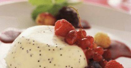 يقلب محتوى القالب فوق صينية التقديم ويزين بالفاكهة الاستوائية أو الفاكهة
