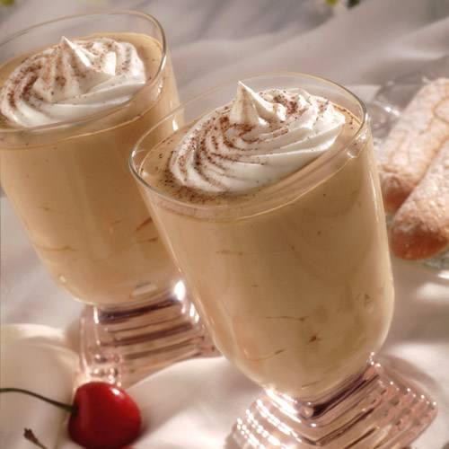 - يخفق البيض مع الصفار والحليب المركز حتى يتجانس المزيج وتضاف القهوة ويخفق جيداً.