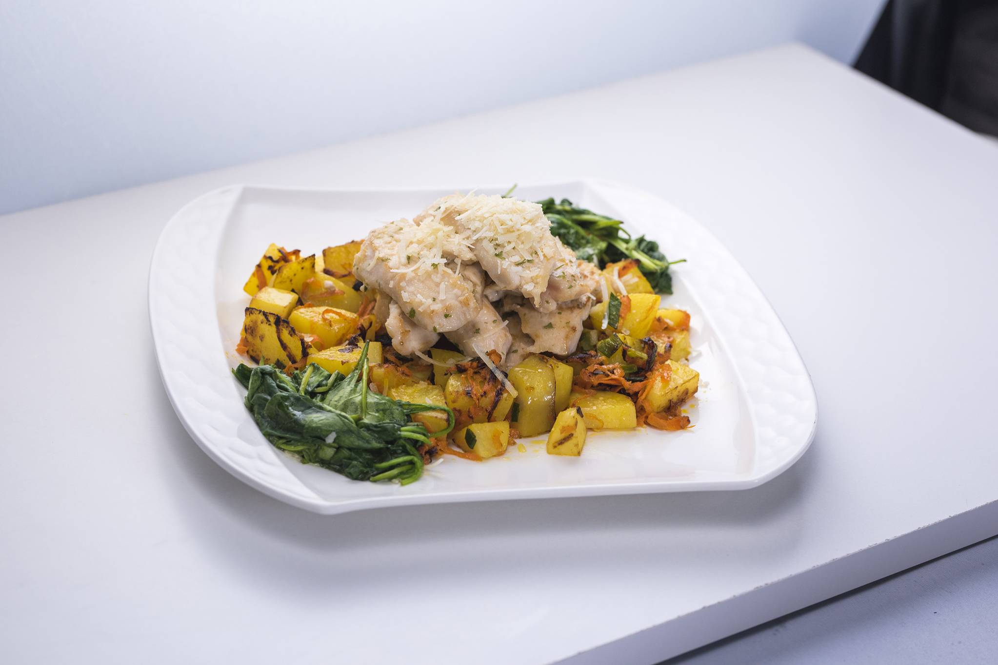 نضع قطع الدجاج مع القليل من زيت الزيتون والملح والفلفل الاسود لمدة ٨ دقائق . ثم نضعها مع البطاطس وتقدم ساخنة