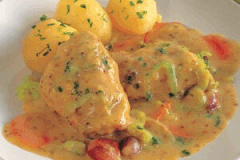- يُزيّن الدجاج بالبقدونس المفروم ويُقدّم مع البطاطا المسلوقة.