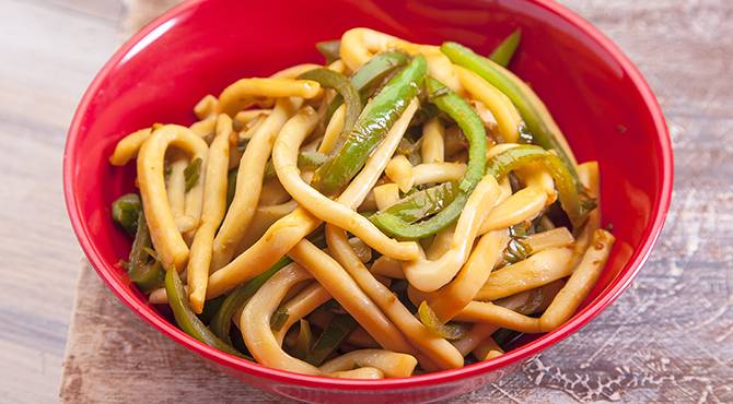 في مقلاة صينية كبيرة (ووك) يسخن زيت السمسم، يضاف الثوم والفلفل الأخضر ويحرك حتى يصبح تطرى المكونات قليلاً.
