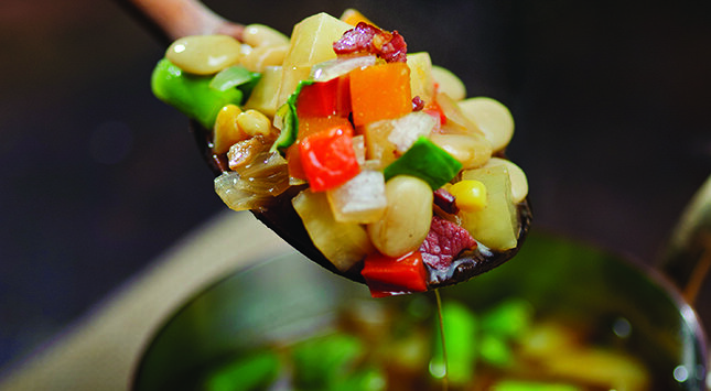 - 2يضاف اللحم المقدد واللوبيا والبطاطا والفاصوليا وورق الخردل والطماطم والذرة وتطهى الخضروات لمدة 5 دقائق تقريبًا.