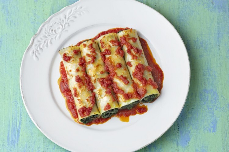 4. احشي الكانيلوني بحشوة السبانخ وصفيها في صينية دون أن تلتصق مع بعضها.