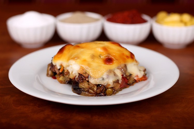 - ضعي خليط الدجاج والباذنجان والصلصة والبازيلا في طبق الفرن ثم وزعي خليط البشاميل فوقه وأدخلي الطبق للفرن على حرارة 180 درجة لمدة 25 دقيقة حتى تتسبك المكونات معاً ويتحمر وجه الطبق.