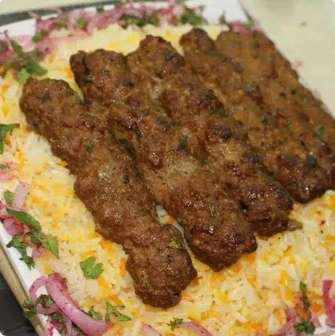 7. نغسل الأرز ونصفيه ونضعه بقدر بدون نقع بالماء ونضيف الزيت والملح والزعفران، وقبل النضوج نضع الجزر المبشور حتى يستوي ونحرك قليلاً، ثم نسكب الأرز بصحن التقديم ونرتب الكباب فوق الأرز ونزينه بورق البقدونس والبصل مع السماق، وبالهناء والعافية.