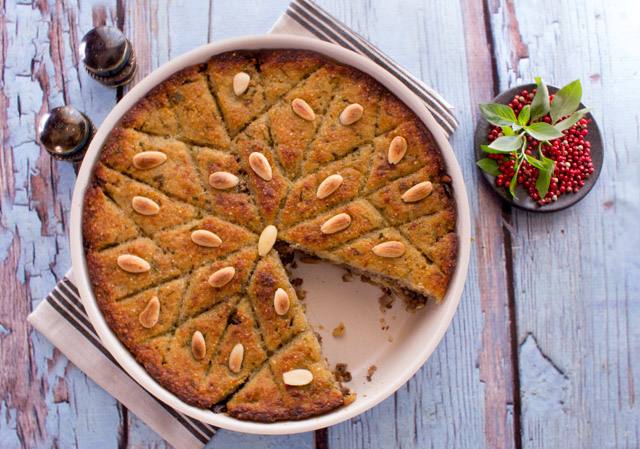 8. توضع الحشوة على طبقة البطاطس ثم تغطى بالقسم المبقي من حشوة البطاطس .