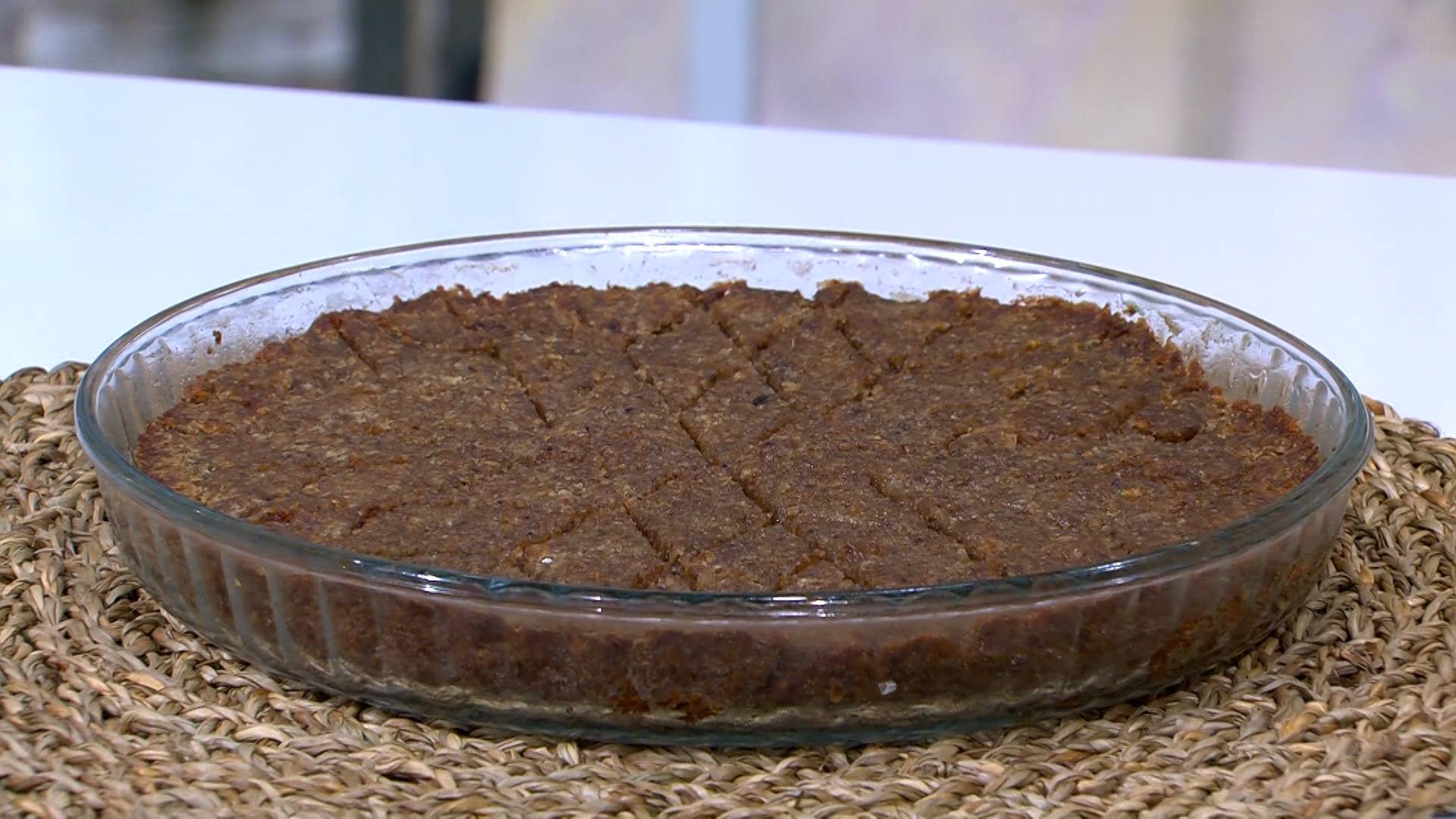 تدهن صينية حجمها مناسب بالسمن وتفرد نصف كمية الكبة ثم تدهن بالسمنة والزيت , يوزع اللحم ثم تفرد بقية كمية الكبة فوق اللحم بالاستعانة بماء بارد لتمليس السطح