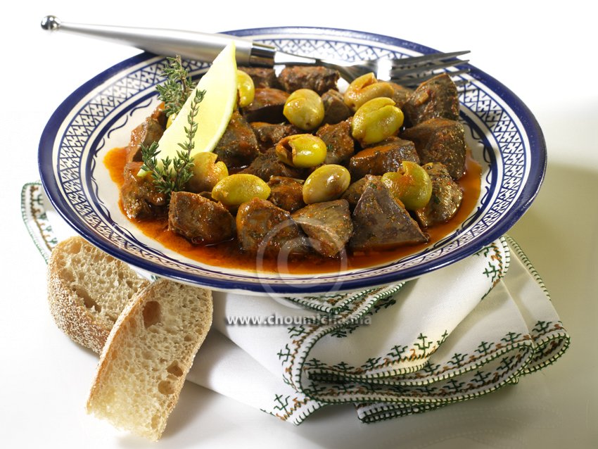 • تضاف الكبد ويستكمل الطهي على نار هادئة مع التحريك برفق لمدة 5 إلى 8 دقائق حتى تتخثر الصلصة ثم يضاف الزيتون الأخضر.