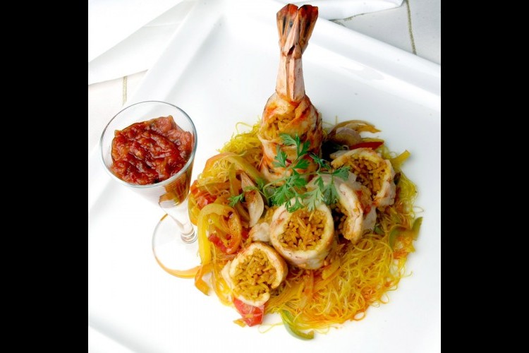 – لإعداد الروبيان: يُقشّر الروبيان ويُنزع ذيله، وتُترك حبّة واحدة مع ذيلها. تًشقّ هذه الأخيرة من الوسط، تُرقّ، ثم تُحشى بالأرّز وتُلفّ بالنايلون بصورة دائريّة، ثم تُسلق بالماء المغلي لمدة 10 دقائق مع الحبّات الباقية. ثم يُنزع النايلون عنها، وتُقطّع إلى دوائر، كما هو موضح في الصورة.