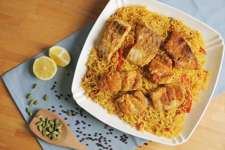 7. ضعي قطع السمك على سطح الأرز، غطي القدر واتركيه على نار هادئة لحوالي نصف ساعة لينضج الأرز تماما.