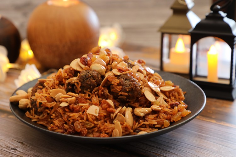 - ضعي الكبسة في طبق التقديم وزيني باللوز والزبيب المحمص وقدميها.