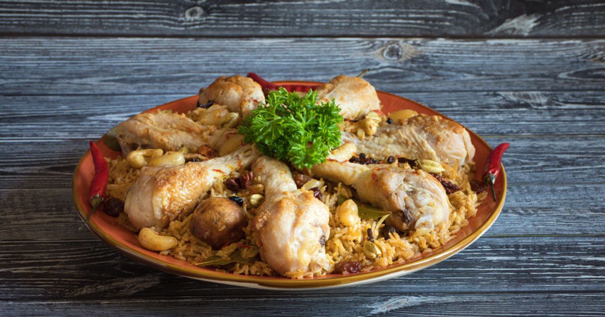 7-أسكبي الأرز في طبق التقديم وزيني وجهه بأفخاذ الدجاج.