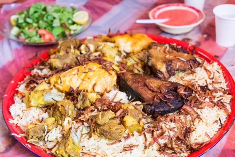 - ضعي الكبسة في طبق التقديم وزيني بالمكسرات والبصل المقلي حسب الرغبة وقدميه ساخناً.