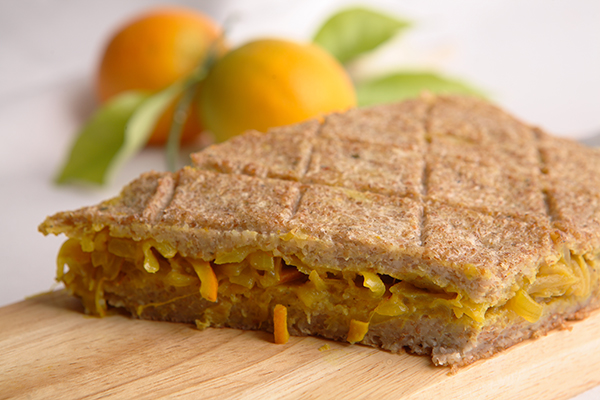 4. تمسح صينية بقطر 30 × 20 سنيتمتراً، بالزيت. تُقسم العجينة إلى قسمين، ويُرقّ كل قسم جيّداً. يُمدّ القسم الأوّل، ويُوزّع الحشو فوقه، من ثم يقسّم القسم الثاني من العجينة إلى أقسام. ترق الأخيرة، وتوضع فوق طبقة الحشو حتّى تغطّيها. من ثم تُجمع بالأصابع المبللة، حتّى يُصبح سطحها مالساً.