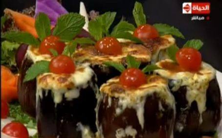 - ضعي الخليط في الباذنجان واضغطي عليه جيدا ثم ضعي شرائح الجبن الحلومى وادخليها الفرن إلى أن تنضج