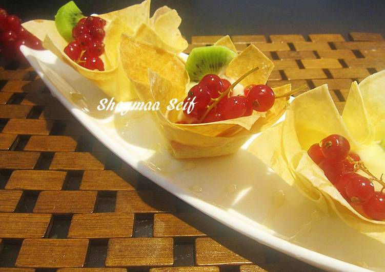 1- ضعي شريحتين من عجينة السبرينغ رول بشكل معاكس داخل قوالب الكب كيك. إدهنيها بالقليل من الزبدة وأدخلي الصينية إلى الفرن على حرارة متوسطة حتى تكتسب اللون الذهبي. 2- في وعاء، أخفقي الزبدة، جبن الكريم والفانيليا. أضيفي السكر البودرة تدريجياً واستمري بالخلط حتى تحصلي على خليط كريمي ناعم. 3- أخرجي قوالب السبرينغ رول من الفرن واتركيها تبرد. ضعي بداخلها القليل من خلطة الكريم تشيز والفواكه. أضيفي قطرات من الشيره وقدّميها.