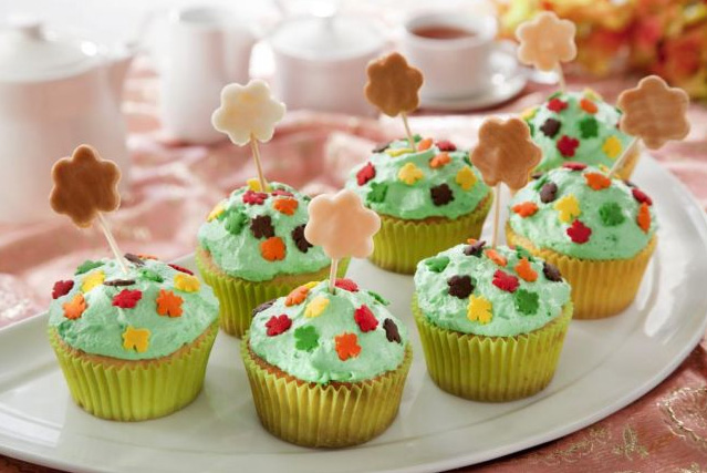 7. استعملي ملعقة عريضة، ووزعي الكريمة على سطح الكب كيك، وزينيها بالحلوى.