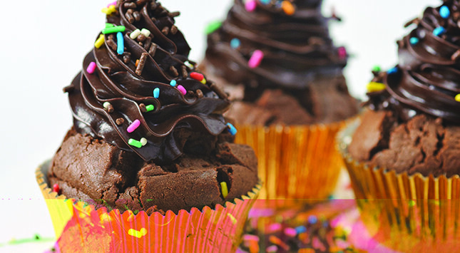 يضخ الجاناش على وجه الكب كيك، ثم تزين الكب كيك برشات الشوكولاتة الملونة.